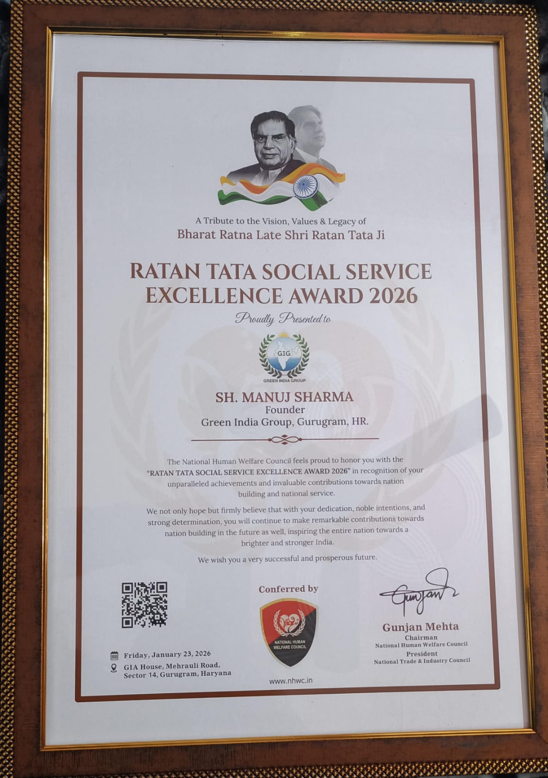 आपकी संस्था को पर्यावरण संरक्षण एवं सामाजिक सेवा के क्षेत्र में किए गए सराहनीय कार्यों के लिए नेशनल ह्यूमन वेलफेयर काउंसिल द्वारा “रतन टाटा सोशल सर्विस एक्सीलेंस अवार्ड – 2026” से सम्मानित किया गया। यह सम्मान हमारी पूरी टीम, सहयोगियों एवं सभी शुभचिंतकों के निरंतर सहयोग, विश्वास और समर्पण का परिणाम है।